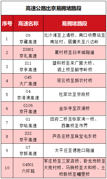 假期首日(10月1日)出京方向交通压力最大。上午8时至12时高速公路出京方向交通压力将持续集中,其中9时至11时最为突出,全日交通量将达假期峰值。京藏、京礼、京承、京港澳、京开、京哈、京平、京新等高速公路出京方向以及六环路部分路段交通压力突出,可能出现行驶缓慢情况。