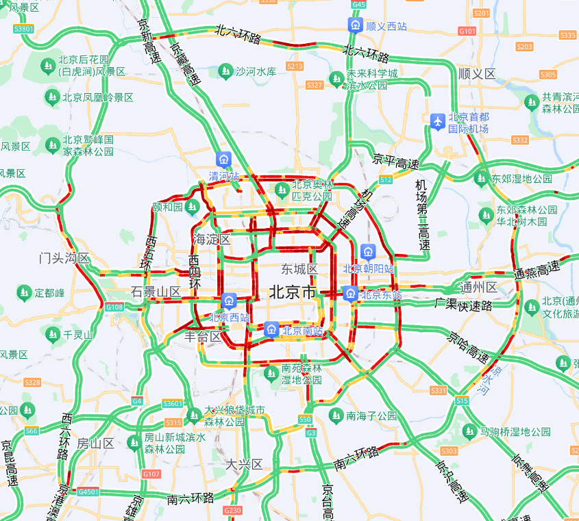 天安门、故宫、景山、鼓楼、颐和园、动物园、天坛、北海、香山、环球影城等市内热门旅游景区游客量将明显增长,预计上午10-12时、下午15-17时为游客集散高峰时段。鼓楼西大街、地安门内外大街、景山前街、香泉环岛、西外大街等部分路段车流集中。