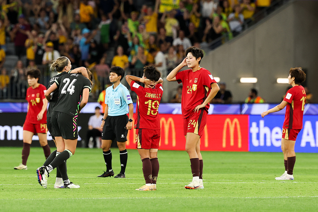 ↑3月17日,亚洲杯半决赛澳大利亚队取胜,中国女足队员失落退场