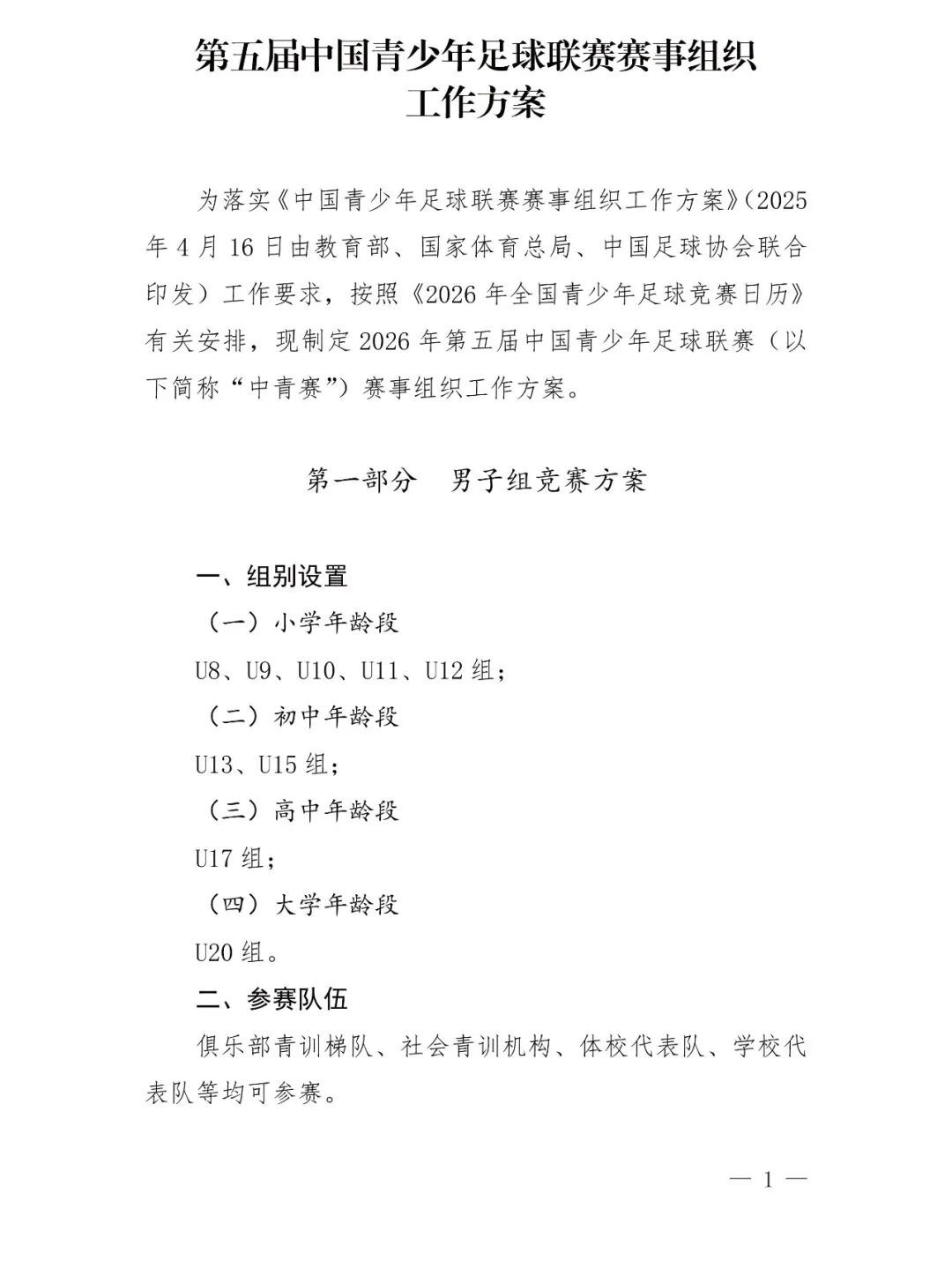 关于印发第五届中国青少年足球联赛赛事组织工作方案的通知 为落实全国足球会议精神和《中国青少年足球联赛赛事组织工作方案》要求,现将研究制定的《第五届中国青少年足球联赛赛事组织工作方案》印发给你们,请认真贯彻执行。