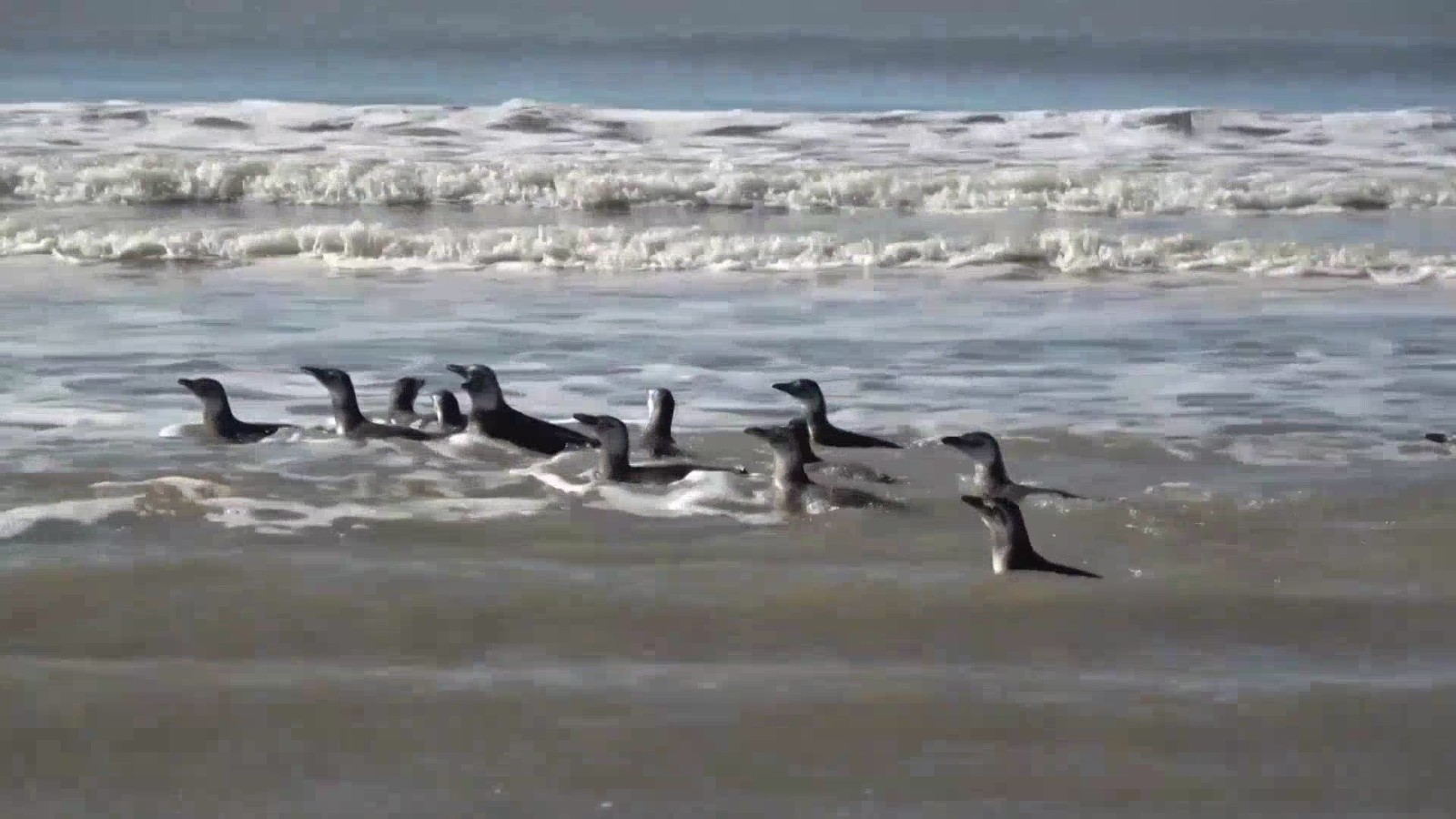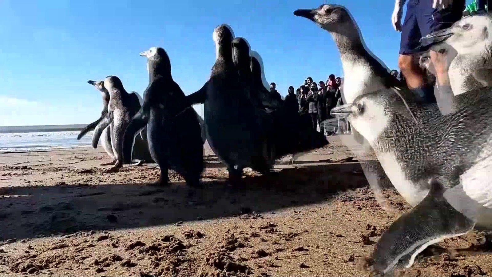 日前,在阿根廷布宜诺斯艾利斯省的一处海滩上,14只经过康复治疗的麦哲伦企鹅“整装出发”,重回自然。