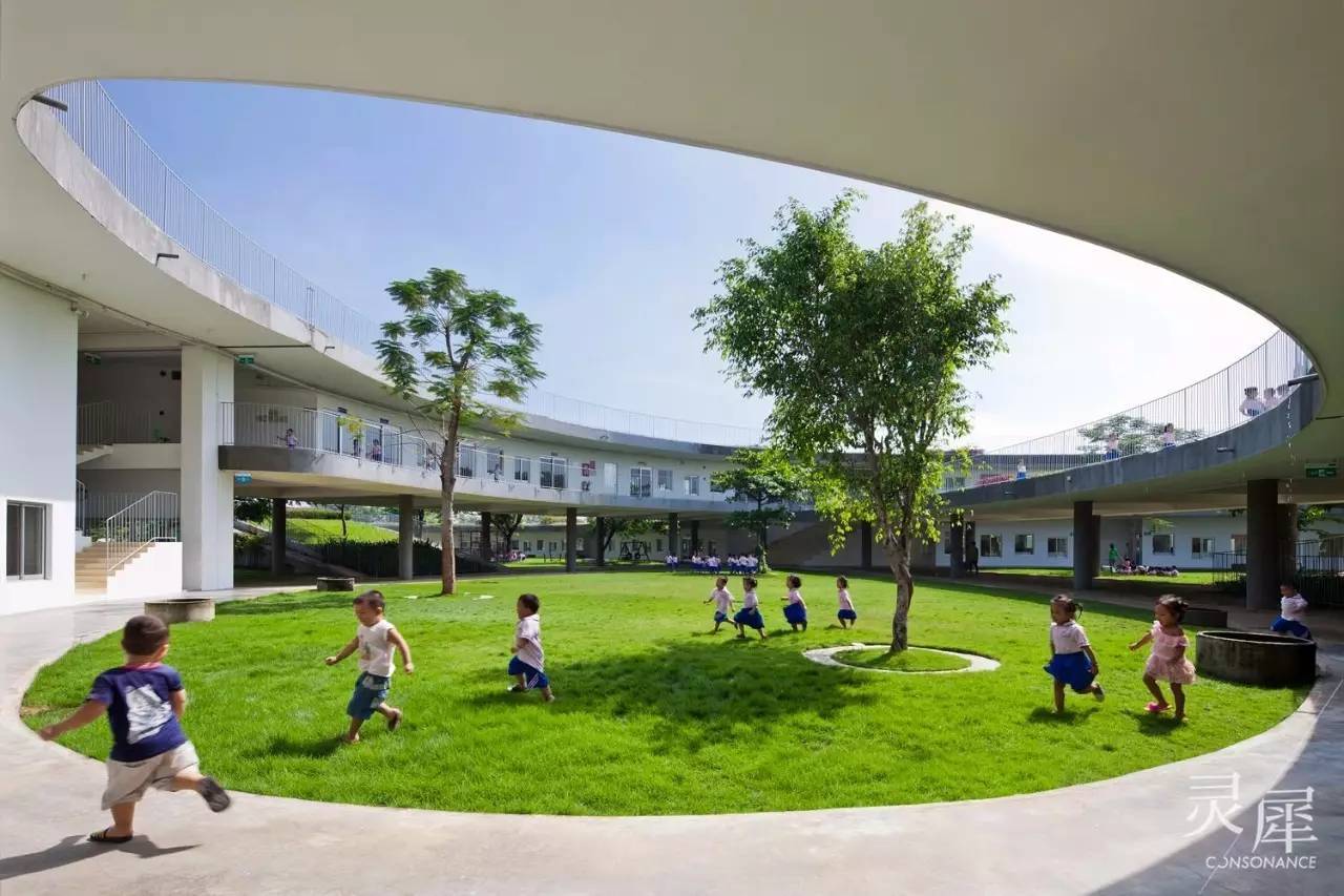 孩子们在建筑围合出的圆弧草坪里玩耍。