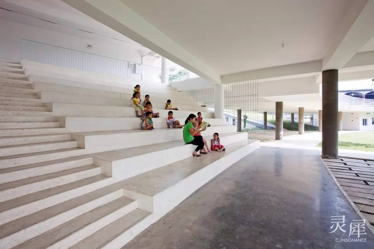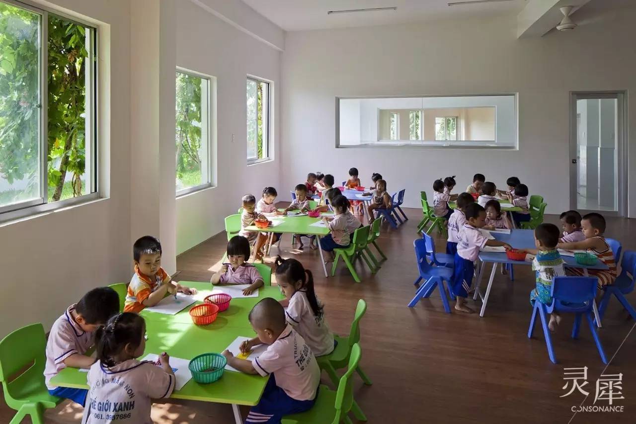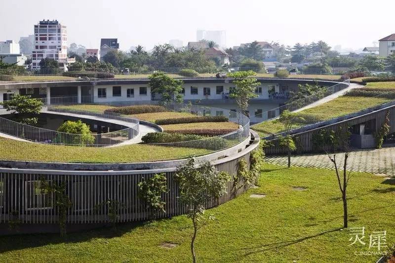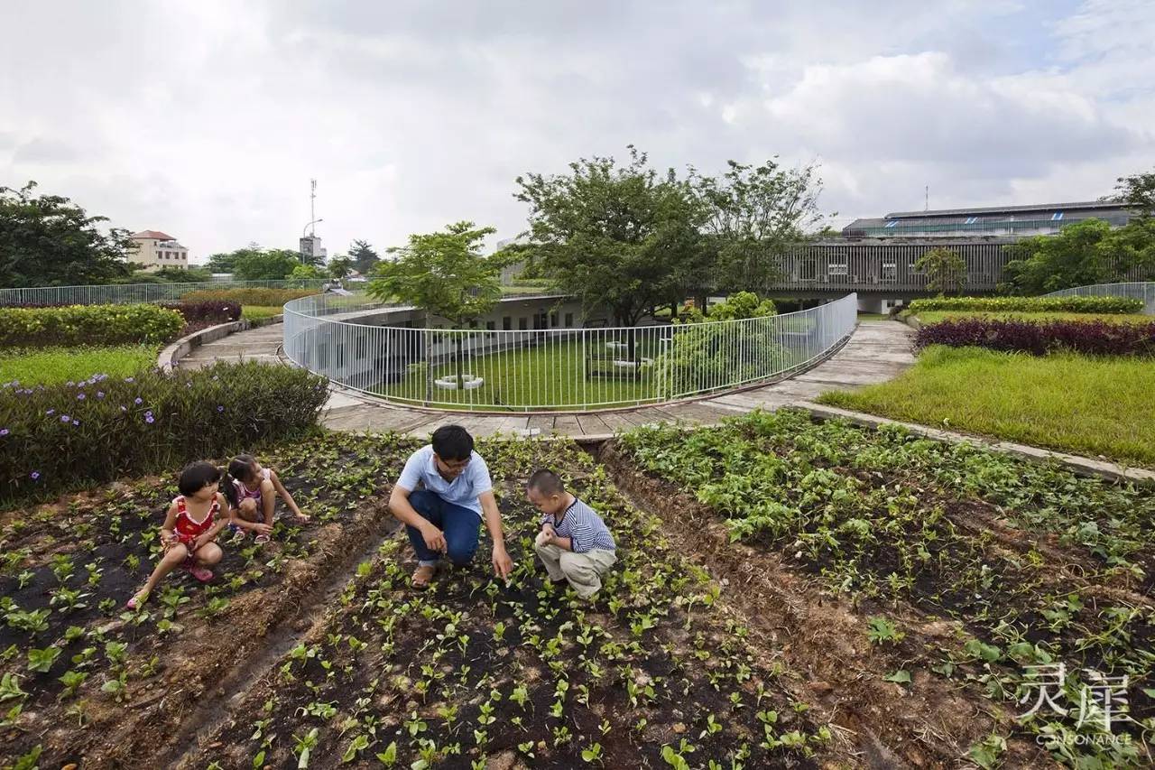 屋顶菜园使孩子们亲近自然的同时还很大地减轻了能耗。越南地处热带气候环境,屋顶作物常年保持葱郁的生长状态,可以产生绿岛效应,加上开阔的环形空间通风效果好,使室内不需要空调等高能耗设备,也能有一个舒适的环境。