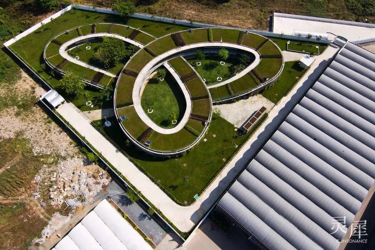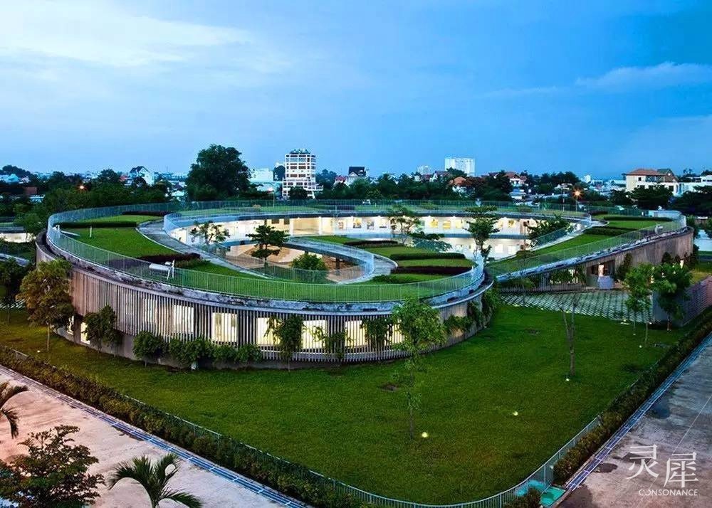 越南农场幼儿园,位于越南同奈省,占地面积达到1.06万平方米,可容纳高达500名学龄前儿童就读。站在高处俯瞰,整个幼儿园呈连环形的「结」结构,围合出三个内部椭圆形庭院,每个庭院都有独特的空间识别性,为孩子们提供了一个安全的玩乐场所。