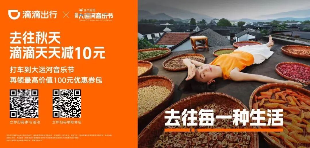 扫码领取/滴滴app、小程序搜索关键词【大运河音乐节】即可领取专属打车优惠,总价值最高100元!立刻领取,开启美好音乐之旅。