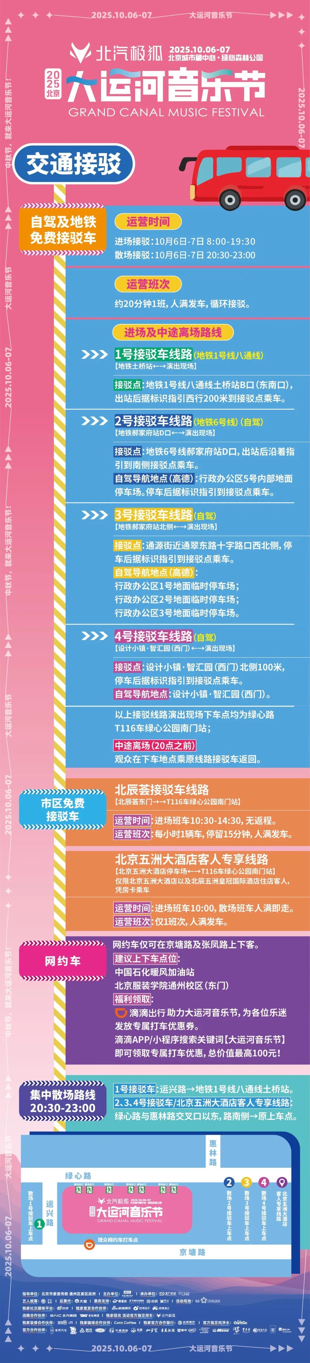我们为大家准备了自土桥地铁站、郝家府地铁站往返于音乐节现场之间的免费交通接驳车,乘坐地铁前往的观众可在1号线八通线土桥站B口或6号线郝家府站D口出站后乘车前往音乐节现场。
