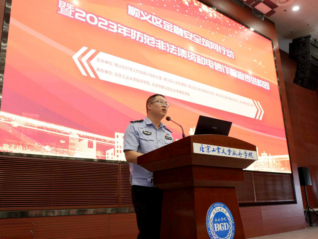 为切实增强公众防范非法集资、电信诈骗及反假币识别能力,顺义区打非工作协调小组办公室、区人民检察院、市公安局顺义分局经侦大队、市公安局顺义分局反诈中心、农业银行顺义支行走进北京工业大学耿丹学院开展防范非法集资及电信诈骗宣传进校园活动。