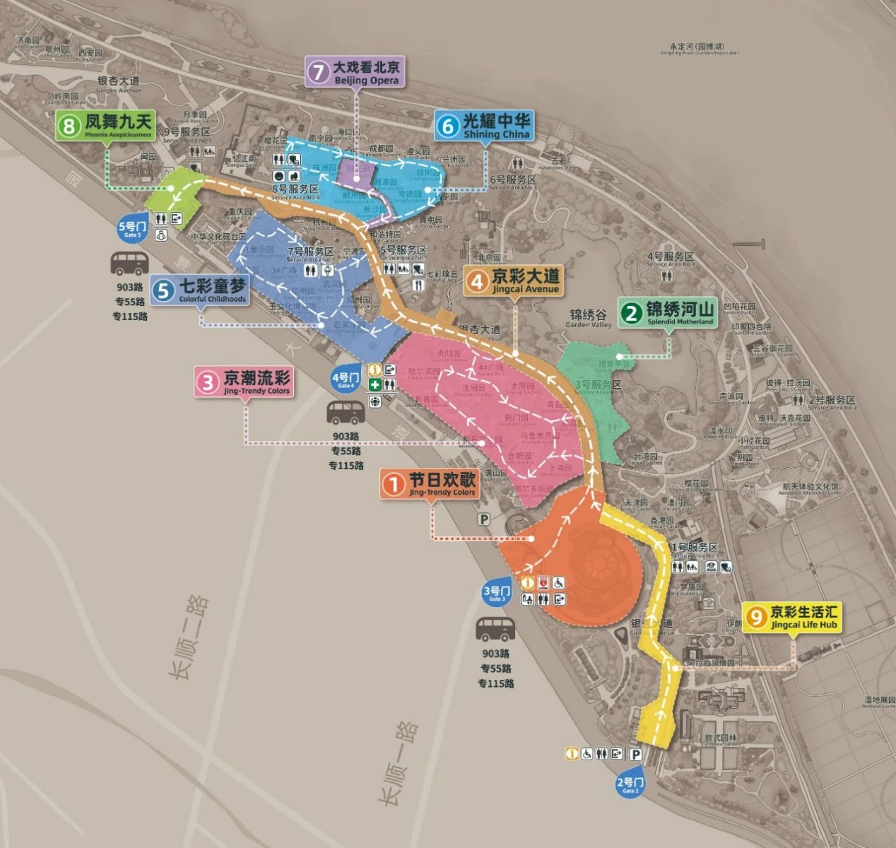 沿京彩大道过了园博园4号门,就可以到达光耀中华、大戏看北京和七彩童梦三大主题区。