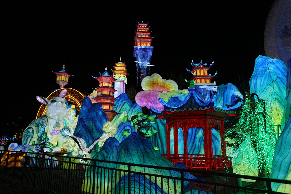 在这里可以看到台湾园的千里共婵娟灯组,以《千里江山图》为蓝本的绿水青山灯组,以及我爱你中国、花园城市、绿色出行等众多创意灯组。