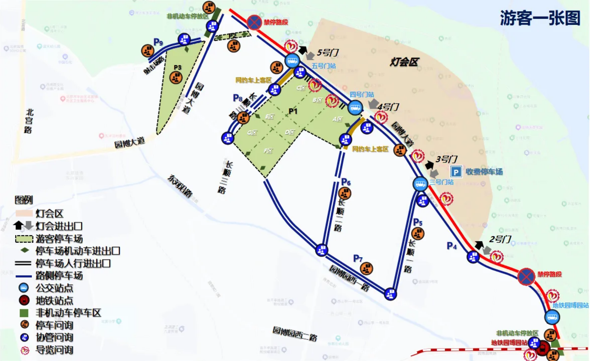 另外,为了方便游客停车,本次灯会还综合利用周边道路,开放了路侧停车,分别位于园博大道、长顺一路、长顺二路、园博西一路、长顺三路以及射击场路园林博物馆以西区域,标号为P4、P5、P6、P7、P8和P9停车场,如P1-P3停车场车位饱和,请您服从现场民警和交通疏导人员指挥,就近路侧停车。