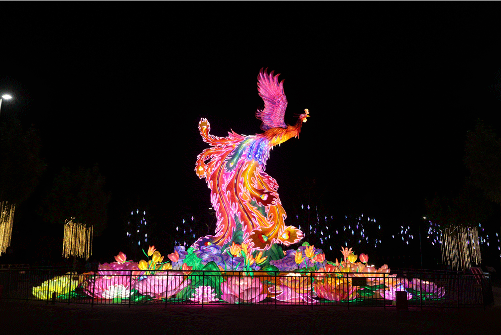 凤舞九天主题去是一个充满了凤舞九天、牡丹富贵、繁荣昌盛、国泰民安美好祝愿的主题区。它所在的位置园博园5号门区域,同时也是通常情况下的出口位置。这也是本次灯会的一个特别安排,希望每一个游客都能在观灯游园之后,得到满满幸福。