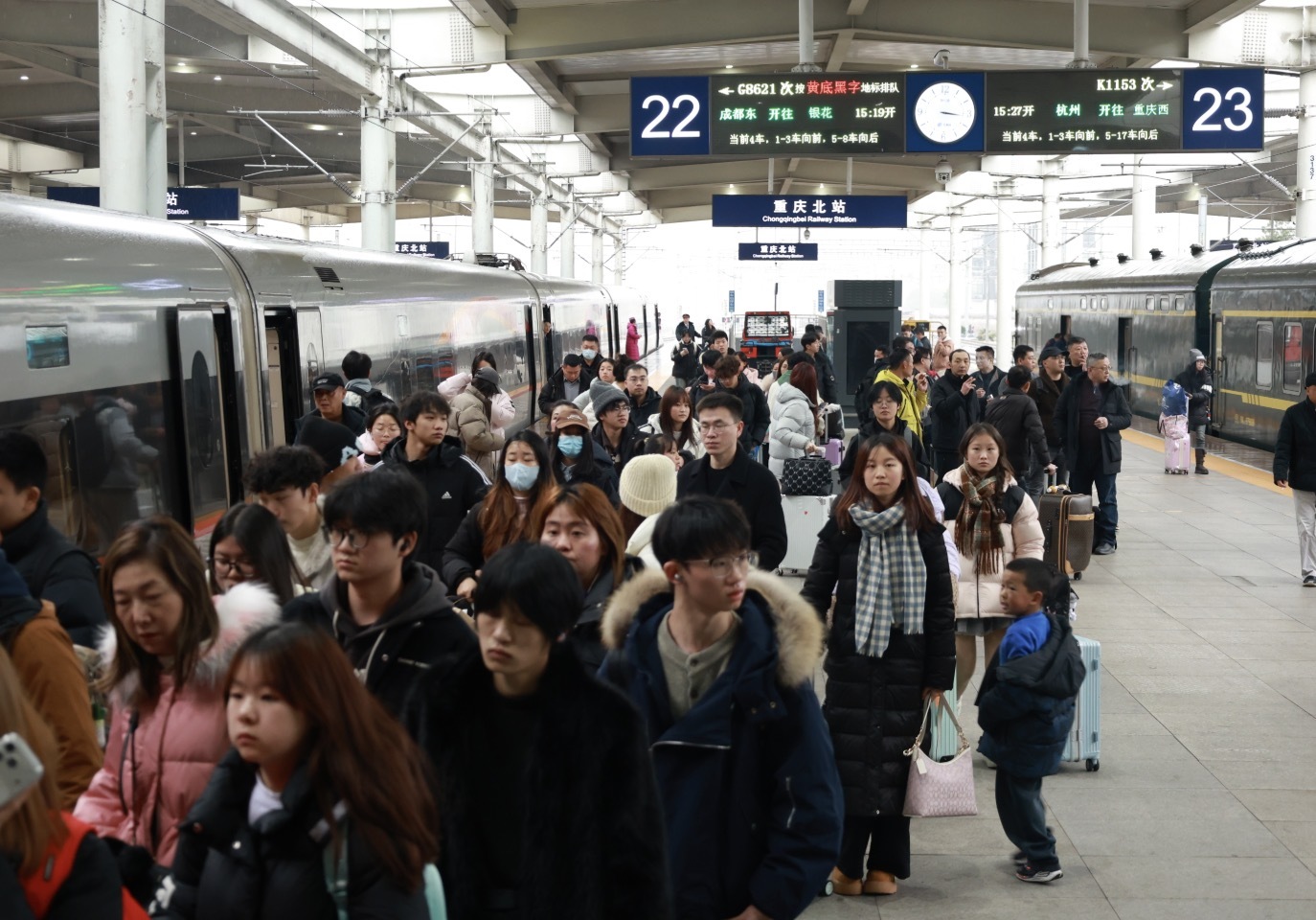 在运力保障方面,春运期间,成都局集团公司动车组配属规模达517组,同比增加42组,高峰期将全部上线运营;增筹16组动车组列车投入华东、华南等热门方向,满足旅客多元化的出行需求;筹备54组普速旅客空调车底,并在成都、重庆、贵阳等地安排多组应急备用车底,确保突发情况下运力充足;计划在高峰时段开行夜间动车组列车171对,其中直通动车组列车111对、管内动车组列车60对,同比分别增加47.5对、10对。