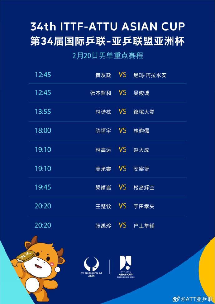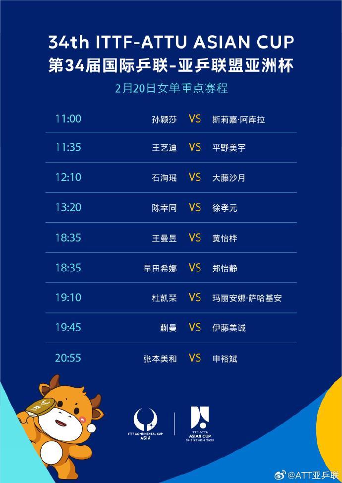 第34届国际乒联-亚乒联盟亚洲杯20日赛程表来了!孙颖莎、林诗栋、王楚钦、王曼昱、陈幸同、王艺迪、梁靖崑、蒯曼、林高远等国乒选手将出战↓一起为国乒加油!