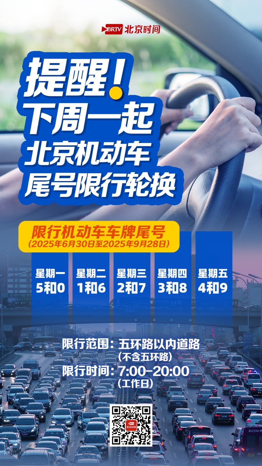 各位车主请注意,明天(6月30日)起,北京市机动车尾号限行即将迎来新一轮轮换,本次轮换周期将持续至2025年9月28日。