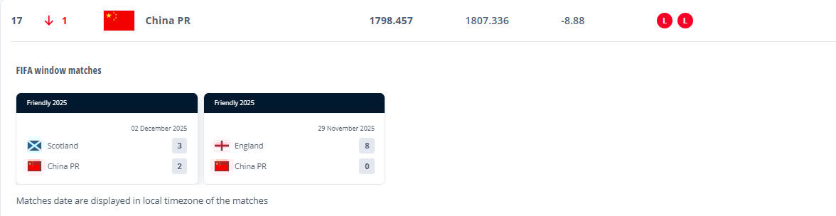 在这一个世界排名的统计周期中,中国女足进行了两场比赛,分别是0比8不敌英格兰队、2比3不敌苏格兰队。在这样的情况下,中国女足的积分相较上期减少8.88分,以1798.457分排名第17位。此前落后中国女足的冰岛女足在这一积分周期两次击败北爱尔兰队,从而超越中国队升至第16位。