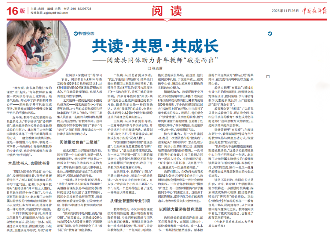 更妙的是人员构成:0-3年青年教师、3-7年成长型教师、经验丰富的引路人,三类人“混龄”结对。“我们有敢问的、能讲的、会想的,刚好!”这种搭配,悄无声息地打破了资历壁垒,让阅读成为彼此认同与连接的密码。