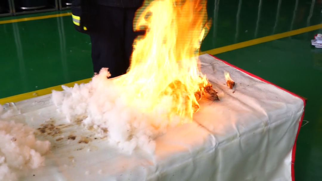 随后,消防员在杨柳絮周围放置树叶、纸箱等可燃物,杨柳絮被点燃后,不到5秒钟,周围可燃物就被引燃了。