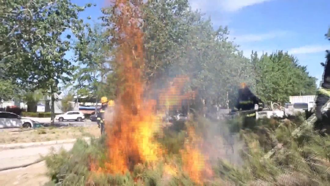 当消防员点燃灌木丛中堆积的杨柳絮,杨柳絮瞬间燃烧,火焰高达1米以上,并引燃了周边杂草和未湿化的绿化带,消防员立即用水枪扑灭明火。