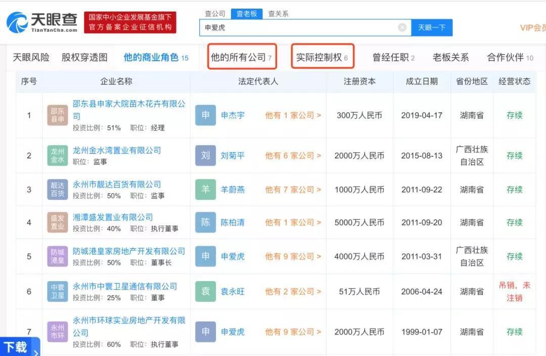 天眼查显示,“申家大院”宅主申爱虎旗下有7家公司,包括:邵东县申家大院苗木花卉有限公司、龙州金水湾置业有限公司、永州市靓达百货有限公司、湘潭盛发置业有限公司、防城港皇家地产、永州市中寰卫星通信有限公司、永州市环球实业房地产开发有限公司。其中,永州市环球实业房地产开发有限公司处于吊销未注销状态。
