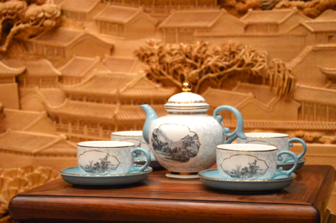 “丝路国宴”瓷为2017年、2019年两届“一带一路”国际合作高峰论坛圆桌峰会午宴用瓷。全套66件,可分为餐具、茶具、酒具等十余种小套件。上图展示的“一带一路”丝路国宴10件唐风茶具礼盒,瓷器形态和谐圆融,饱满大气;“水韵蓝”色釉堪称雁栖湖景致的完美写照;《富春山居图》传世名画贯穿其中,平添神韵。“丝路国宴”餐瓷采用了高温色釉、珐琅彩、手工描金等工艺,每件瓷器都历经原材料配制、成型、烧成、装饰等数十道工序,展现了传统的中国韵味和当代中国陶瓷工艺的顶尖水准。
