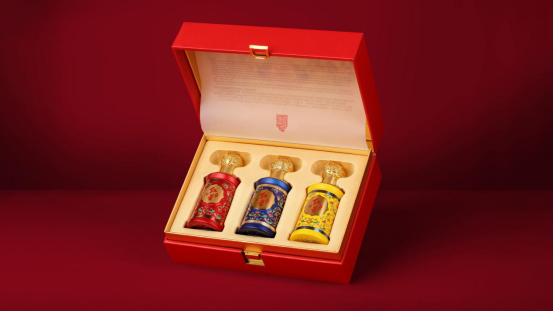 作为国家级非遗二锅头酒技艺的传承品牌,红星这款礼盒以“可视京韵+可品传承”为核心,将北京皇城文化与二锅头酿造技艺精粹完美融合。礼盒以中国红为主色调,正面绘制“福”纹与缠枝莲纹,辅以北京建筑元素。礼盒中三款酒分别选用红、黄、蓝配色,饰以缠枝莲纹、宝相花纹等吉祥纹样,呼应“红星钰玺”福瑞寓意。此外,酒体风味各具特色:鸿钰清香纯正,酒体醇甜舒适,尾净爽口。煌钰清香花果香协调,酒体醇甜绵顺,回味悠长。斓钰陈香清雅复合,酒体醇厚绵甜,诸味平衡。