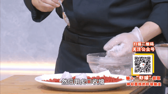 制作虾球:手上抹适量油,把虾胶放入手中反复团捏,用虎口收缩挤出虾丸球;将虾球表面裹上脆花粒。