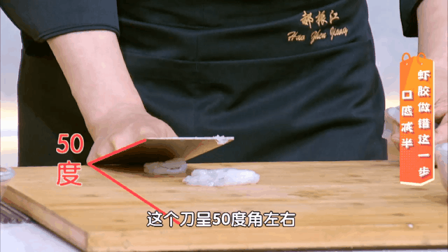 食材处理:鲜虾去虾头剥掉虾壳,刀背与案板呈50度将虾肉拍成虾泥,用刀背快速锤虾肉制成虾胶。