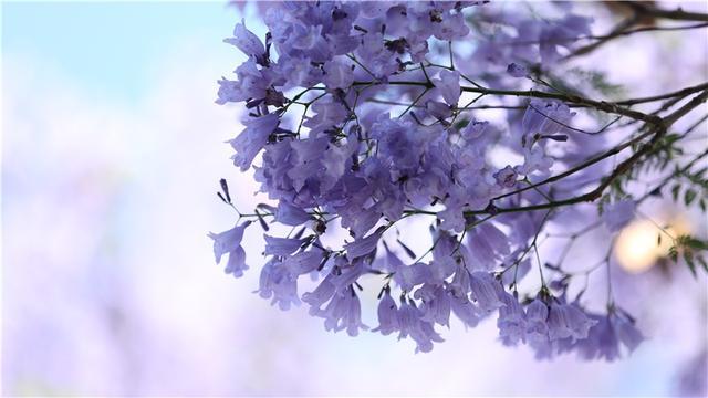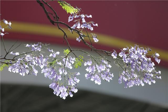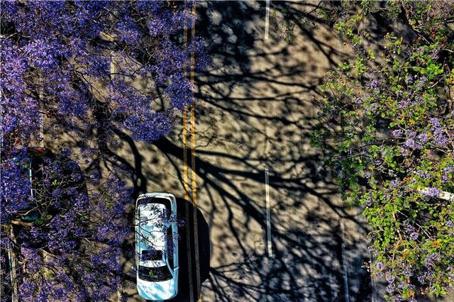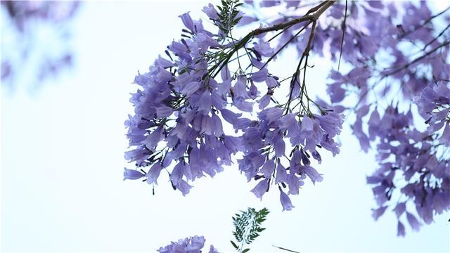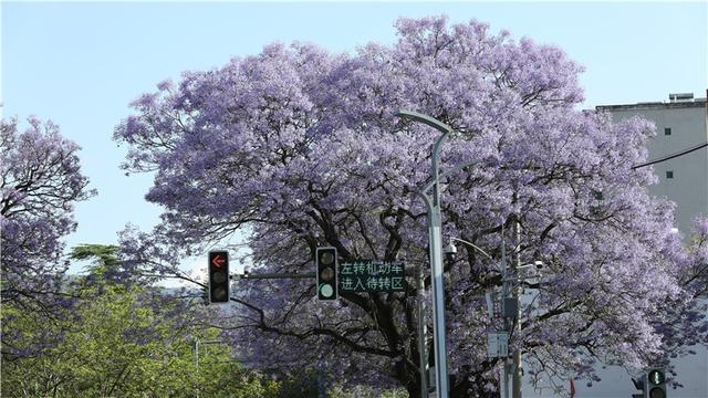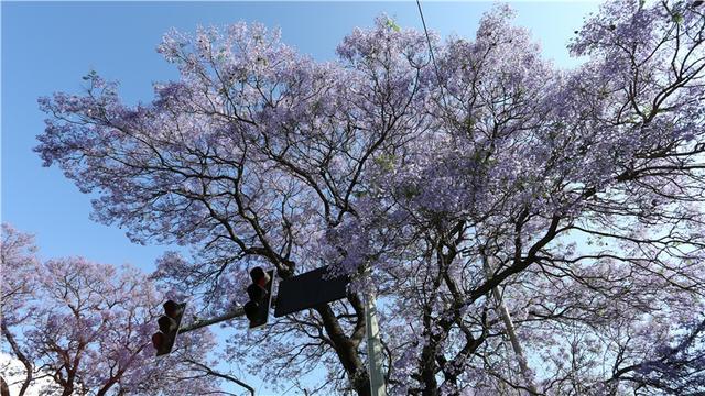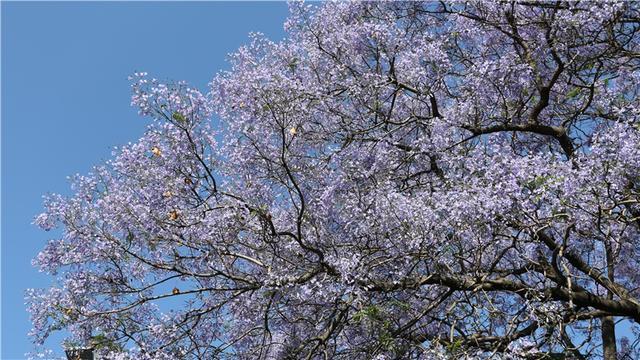 蓝花楹来自南美洲,中文名字翻译的“楹”,非常妙,一来音韵和谐,二来也极为贴切,《说文解字注》中记载,楹、亭也。亭亭然孤立、旁無所依也。“亭亭如盖”正是这一街蓝花楹的完美写照。