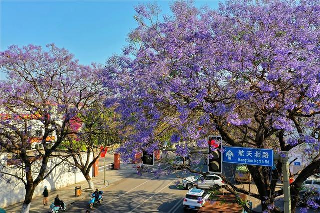 航天北路是西昌最美的蓝花楹街道,据说,这里的蓝花楹于1994年栽种,28年间因其自由生长,恣意绽放,年年凭实力冲上网络热搜,还多次被人民日报、央视提名点赞。