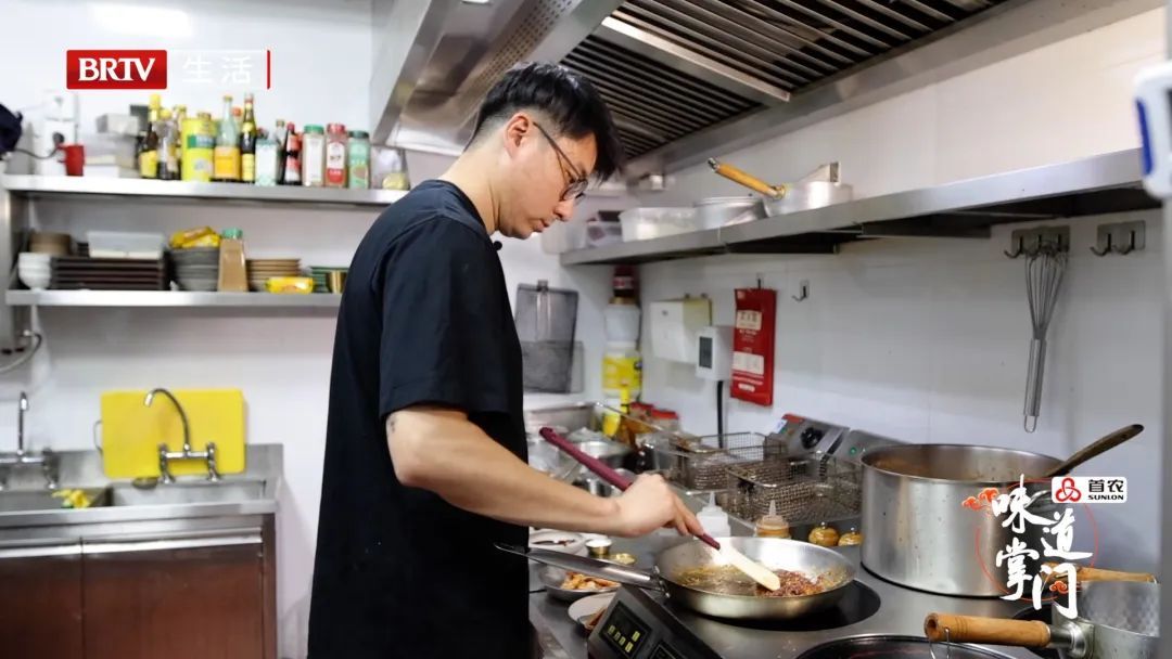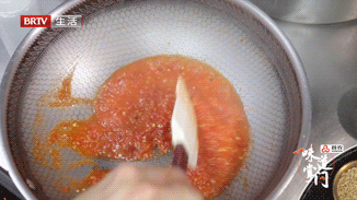 赵雷决定用西餐中熬制酱汁的方法,把这些材料做一个全新的组合。新鲜番茄和辣椒打碎,炒出其中的水汽,加入北方人喜爱的甜面酱,增加甜度的同时,还能起到上色的作用,再放入其他调味料。接下来,就是一个既耗时又耗人工的关键环节:搅拌。赵雷认为,不停的搅拌,可以让一些成分挥发,提升整体味道。