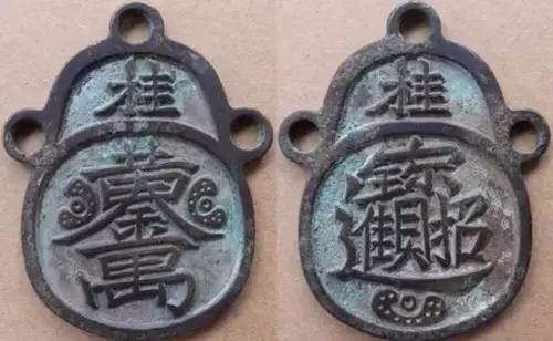 上图为民间的一种花钱。花钱,并非流通币,而是被当做吉利品或避邪物使用。在花钱上,常常可以见到连笔减划的“黄金万两”、“招财进宝”之类的四字合体。