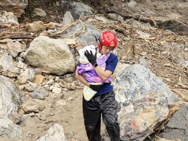 在草场村转移途中,一名怀抱4个月大婴儿的母亲求助:婴儿因无母乳、奶粉耗尽需紧急转移。面对乱石密布、到处泥水的道路,两名消防员一组抬起婴儿车稳步前行;遇陡峭断崖时,队员用床单撕成长条,自制背负带,将孩子稳稳系在身后。母亲全程紧护孩子,连声道谢:"没有你们,真不知该怎么办。"