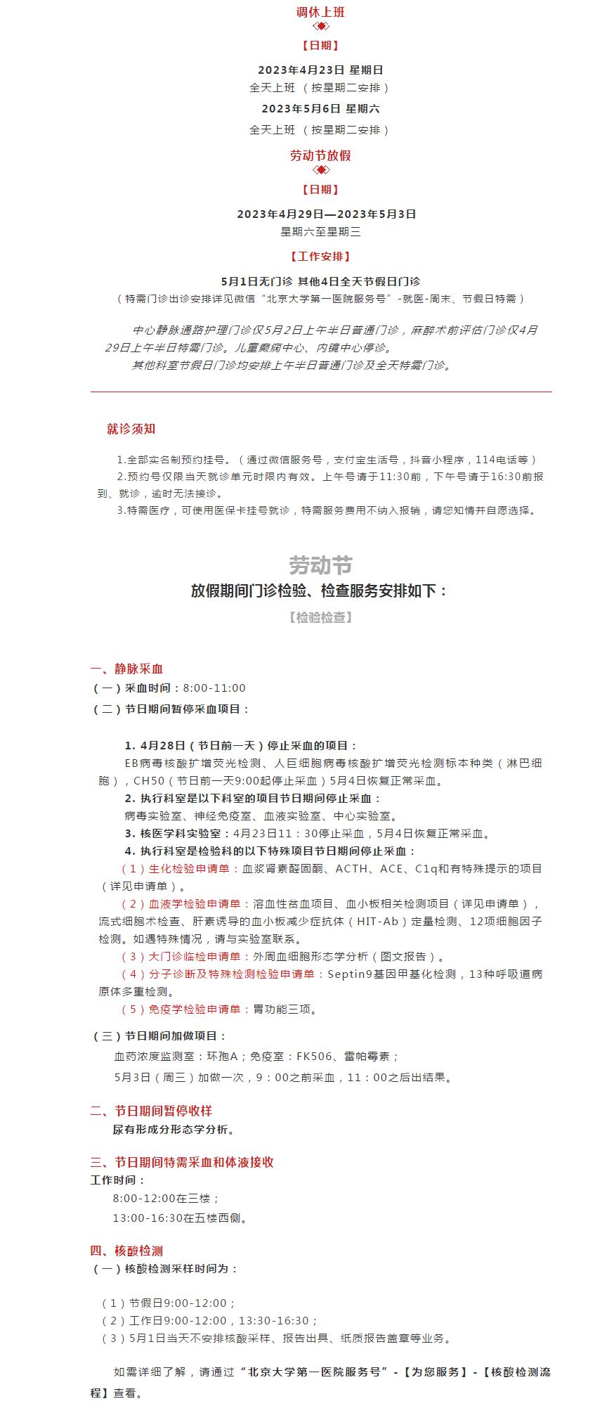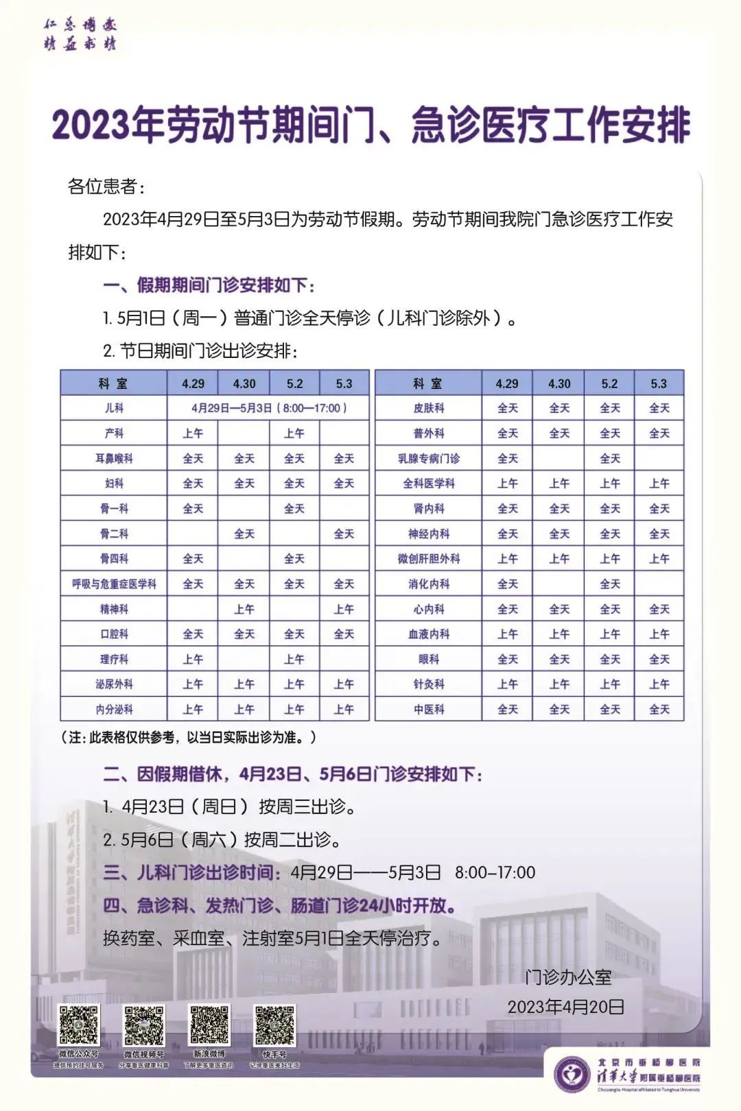 · 4月23日与5月6日普通门诊全天开诊,专家门诊及专科门诊暂停。