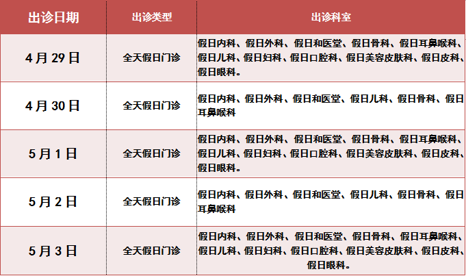 4月29日至4月30日(周六至周日)、5月2日至5月3日(周二至周三):上午半日门诊,专家或普通