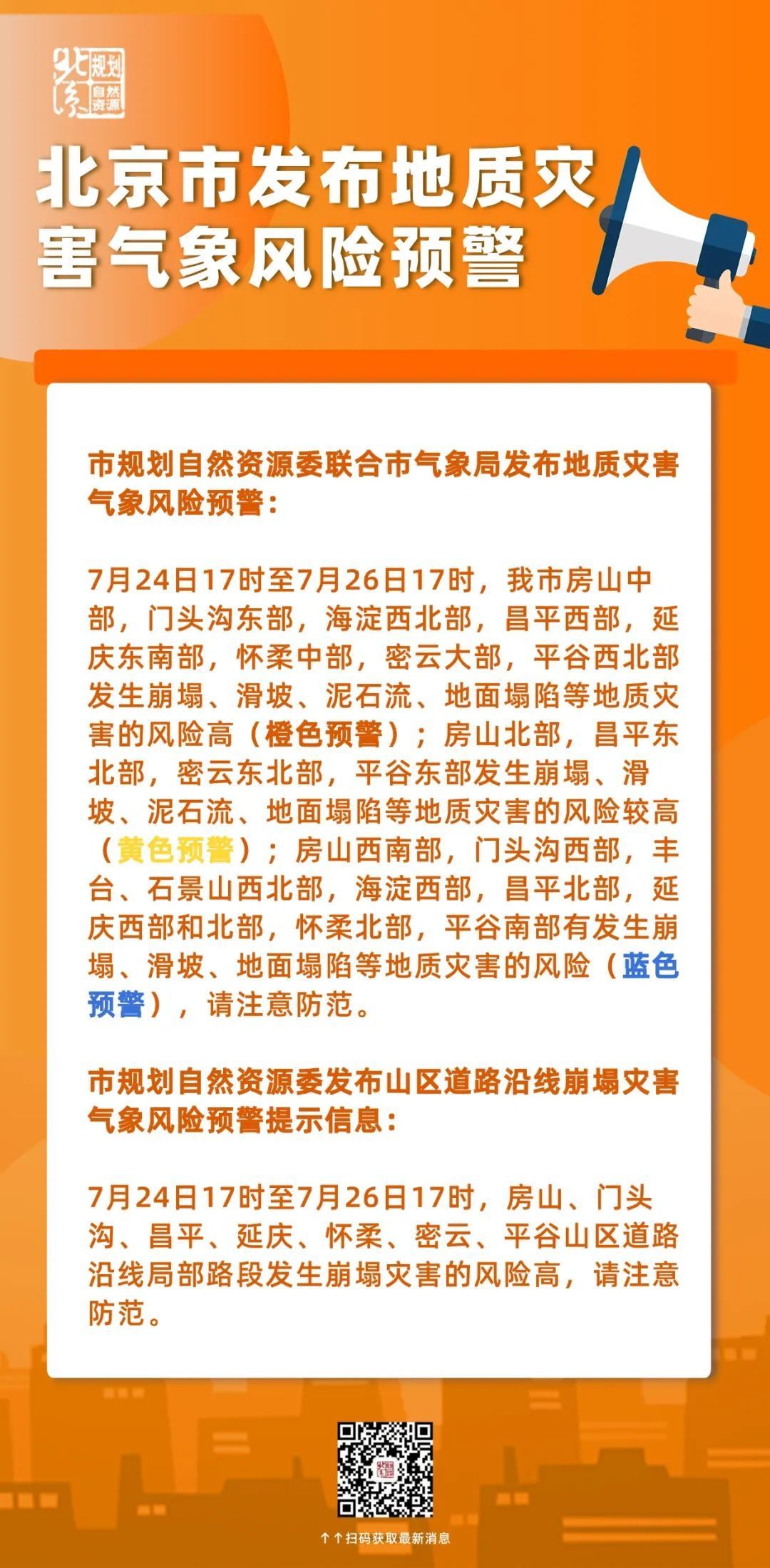 市规划自然资源委发布:7月24日14时至7月26日14时,房山区、门头沟区、昌平区、延庆区、怀柔区、密云区、平谷区局部路段山体斜坡发生崩塌灾害的风险较高,请注意防范。