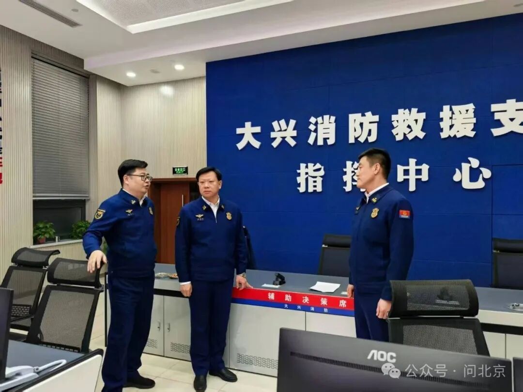 大兴区消防救援支队政委余艳华(中)在指挥中心视察工作/记者 摄