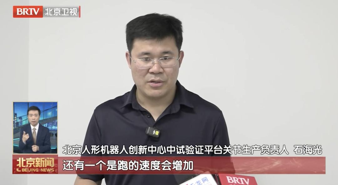 北京人形机器人创新中心中试验证平台关节生产负责人石海光介绍:“大扭矩关节能实现稳定的奔跑,机器人跑步速度也会加快。”
