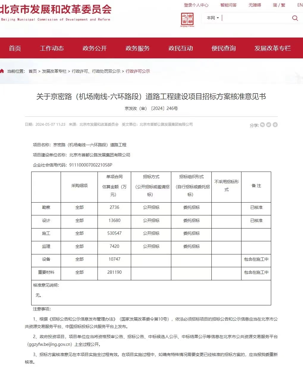 近日,京密路(机场南线—六环路段)道路工程建设项目招标方案核准意见书公布。