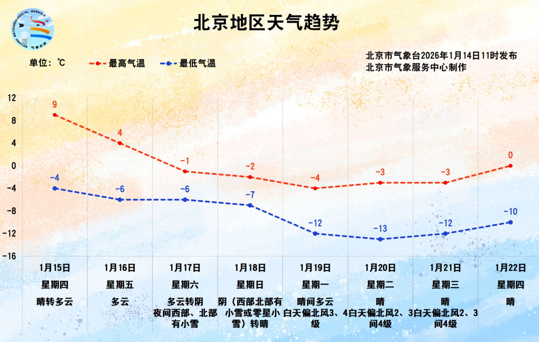 明后(15日至16日)两天,北京晴朗在线,明天最高气温将升至9℃,中午时段寒意将明显缓和,后天又会降至4℃左右。