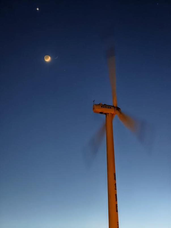 2025年1月3日在山东荣成市环海路上,风力发电机组与金星、月亮组成一幅美丽画卷。(钟奕摄)