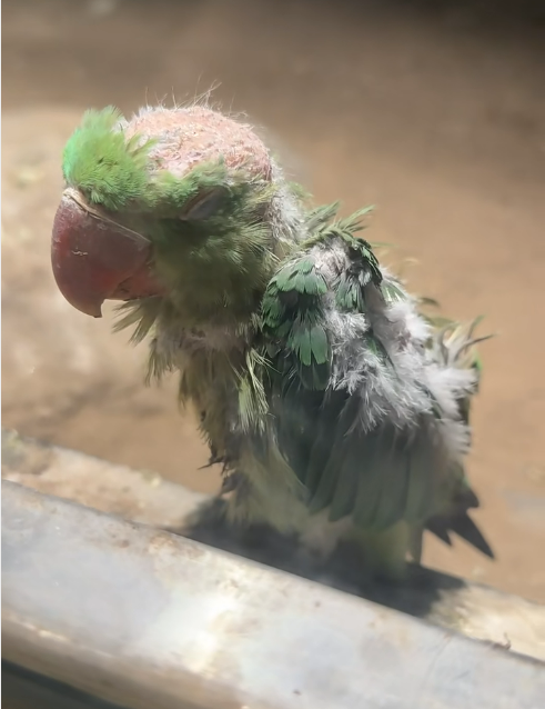 网友拍摄的视频中,鹦鹉头顶绿色的羽毛有部分脱落,露出皮肤。网络视频截图