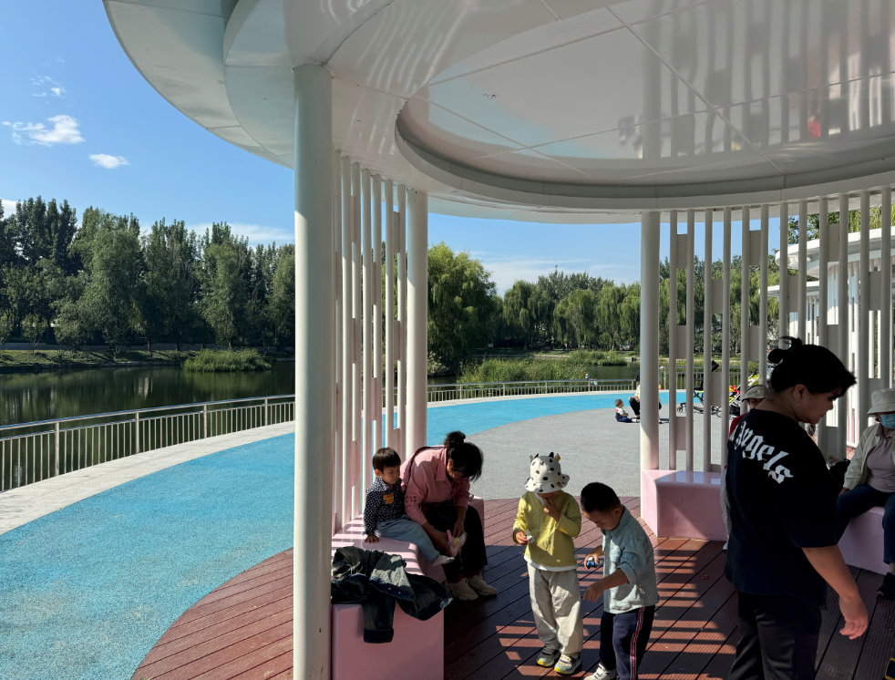 在101人工湖旁,不少居民在此休憩、带娃、锻炼身体。湖边精心设计了步道、座椅、球场等,既满足了居民的日常休闲需求,又美化了城市环境。