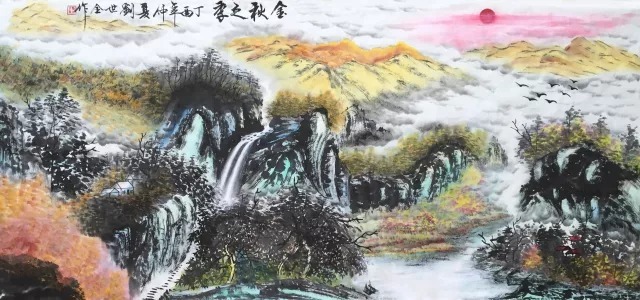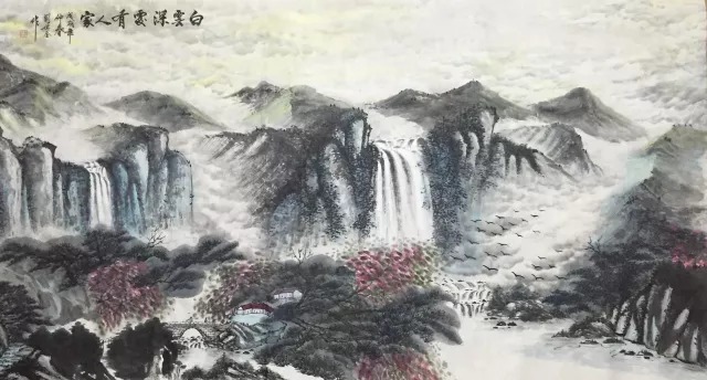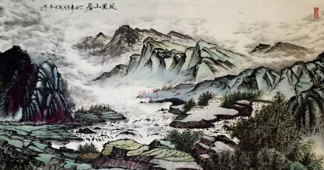 他的山水画坚持“魏晋风度的渗透,崇尚自然的必然,文人个体意识的觉醒,人们对自然山水的审美感知”的创作原则,其作品既描写自然风物的外貌及丰富变化,又注重显现运动中的内在联系,使他的山水画创作达到形神一致情景交融的意境。在《凤凰山居》中,近山重墨轻彩,远景淡施青黛,溪水淙淙,岩树丛丛,远处田园景象,一派悠然。画作笔笔传神,点点释意,将天地、人文浑然而为。