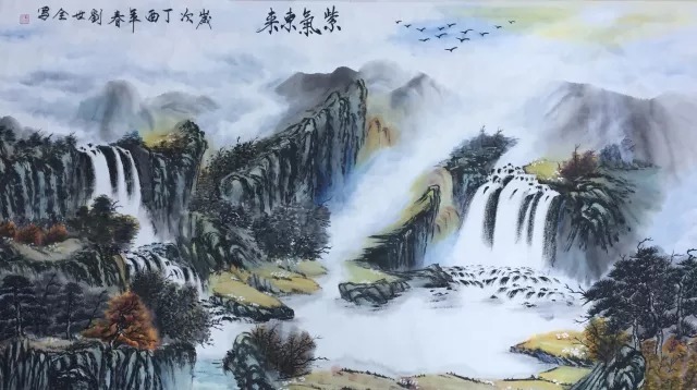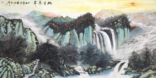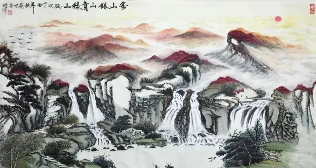 他的山水画坚持“魏晋风度的渗透,崇尚自然的必然,文人个体意识的觉醒,人们对自然山水的审美感知”的创作原则,其作品既描写自然风物的外貌及丰富变化,又注重显现运动中的内在联系,使他的山水画创作达到形神一致情景交融的意境。在《凤凰山居》中,近山重墨轻彩,远景淡施青黛,溪水淙淙,岩树丛丛,远处田园景象,一派悠然。画作笔笔传神,点点释意,将天地、人文浑然而为。