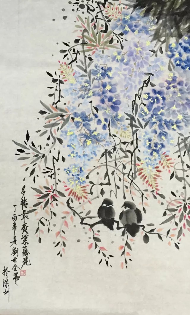 唐代张彦远曾言:“意存笔先,画进意在。”刘世全深知其意,他的花鸟画讲究笔墨技法,在画面中通过线条、墨色来塑造花鸟形象,骨气形似本于立意,而归乎用笔。画面中简练概括、酣畅淋漓用笔,恣意挥发的墨色耐人玩赏。