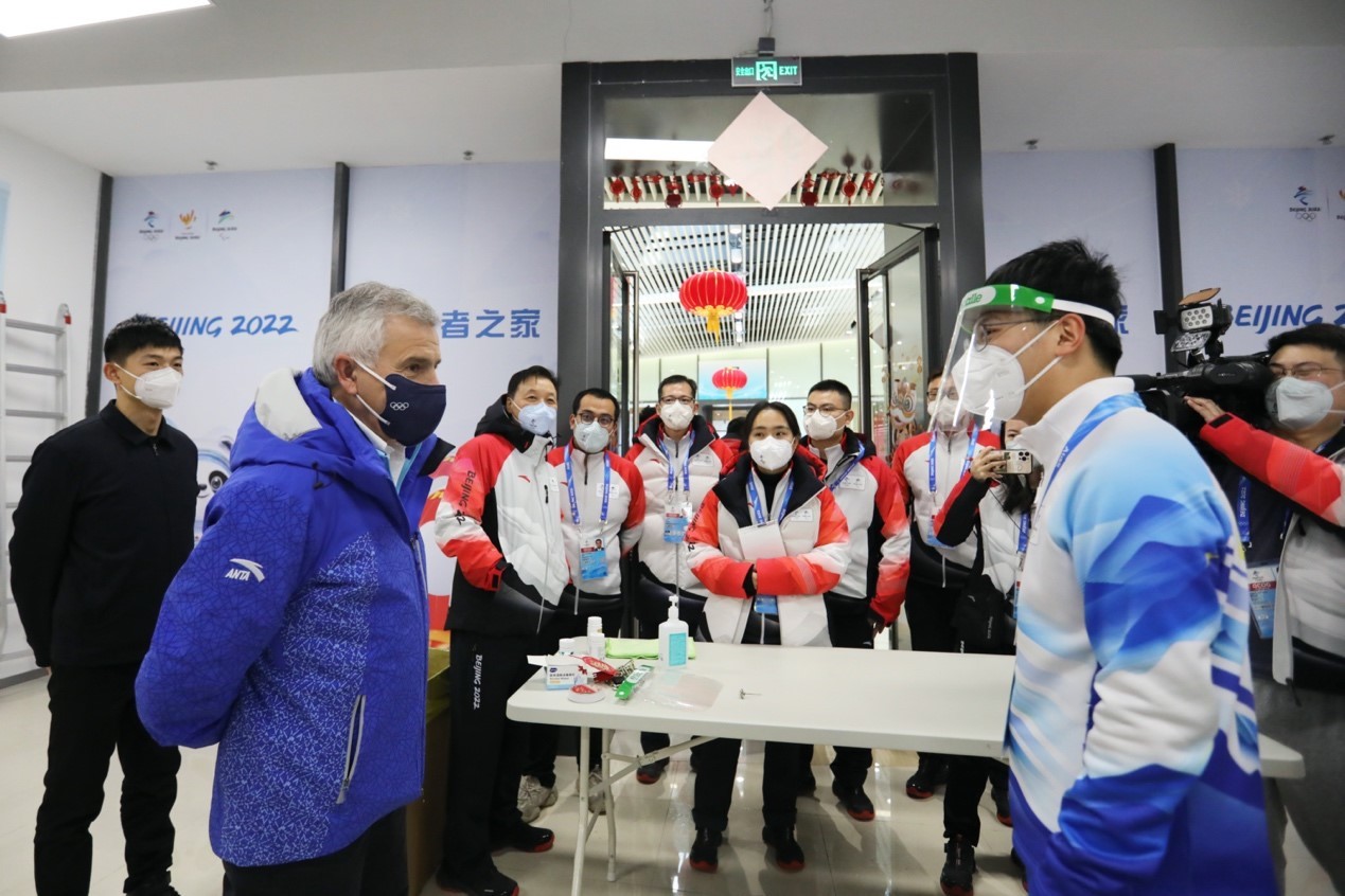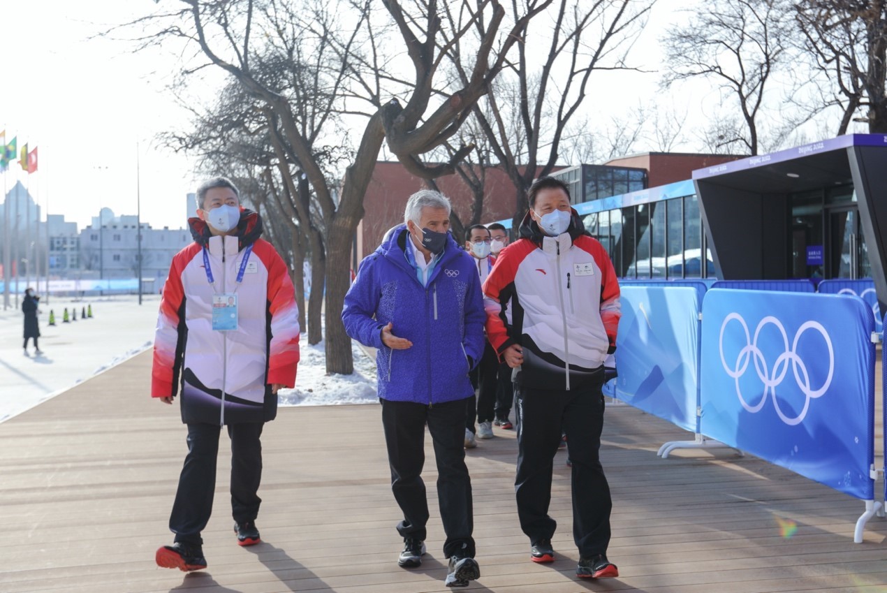 报道)2022年1月25日,国际奥委会委员、国际奥会委北京冬奥会协调委员会主席胡安·安东尼奥·萨马兰奇参访北京冬奥村,北京冬奥组委副主席杨树安、北京冬奥村运行团队主任沈千帆陪同参访。
