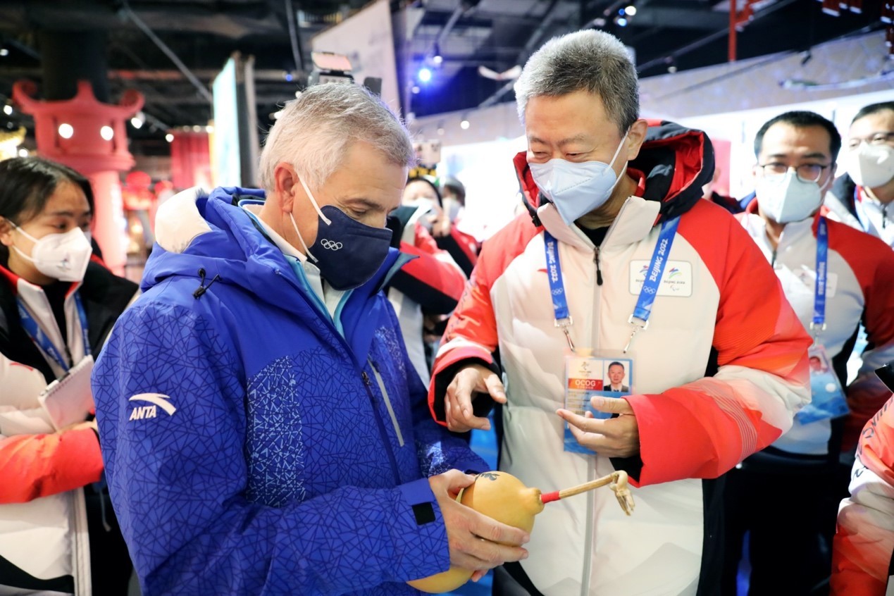 沈千帆代表北京冬奥村将北京市非物质文化遗产-火绘葫芦赠送给萨马兰奇。这只火绘葫芦绘有兰花,象征着“富贵、平安、吉祥、如意”。萨马兰奇表示感谢并称将珍惜这份来自北京冬奥村的特别礼物。