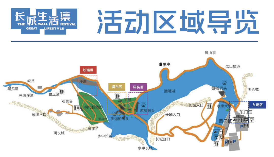 瀑布区的百草滩羊的羊棒骨、京满厨的粘豆包与怪怪趣、杨记热干面、鲜肉研究所、BK牛蘑王、百香福炸鸡架、泰式冰沙等品牌同台呈现,多元风味在长城脚下即可打卡。