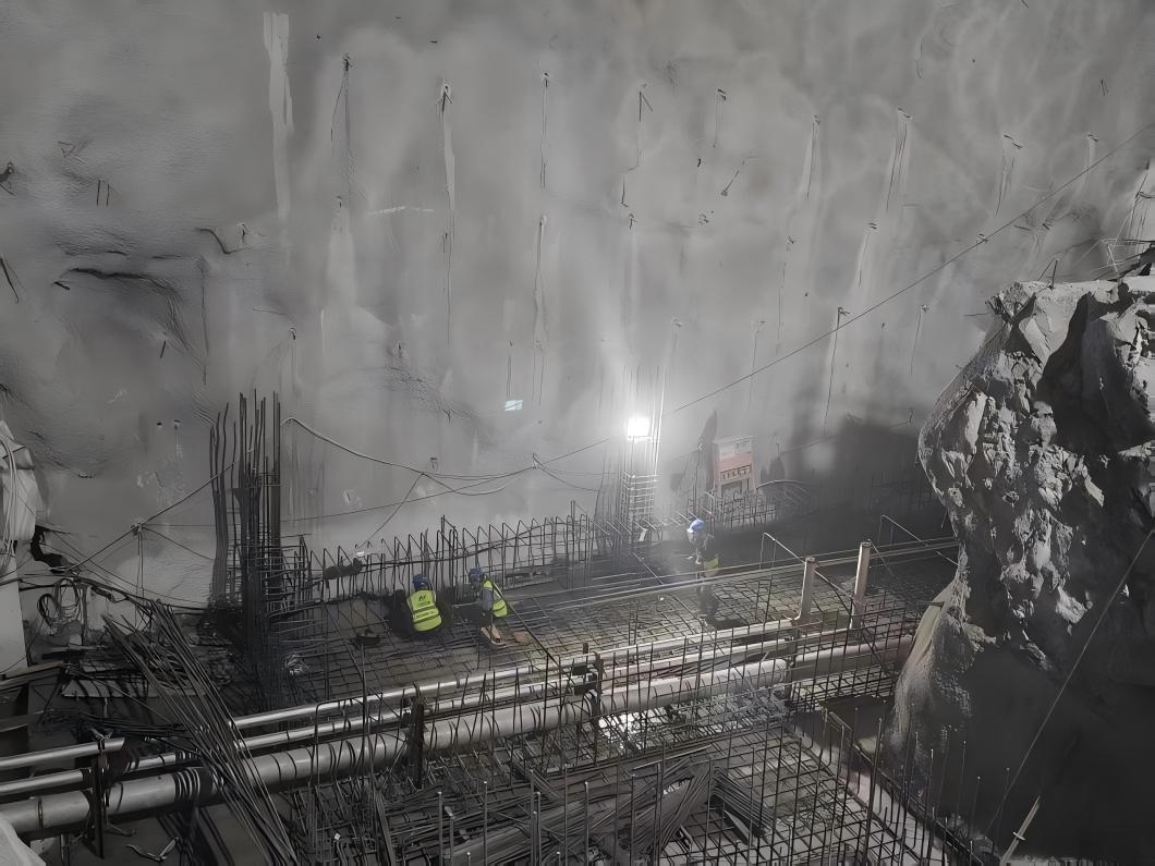 在地下洞群施工中,主副厂房作为电站“地下心脏”,其238米长、28米宽、57米高的空间内,岩锚梁是支撑4台35万千瓦发电机组的“承重脊梁”。冬季干燥少雨的气候特点,恰好为地下洞室施工创造了“黄金窗口期”,项目部牢牢抓住这一机遇,将施工细化为多个关键节点,有条不紊持续推进项目进度。