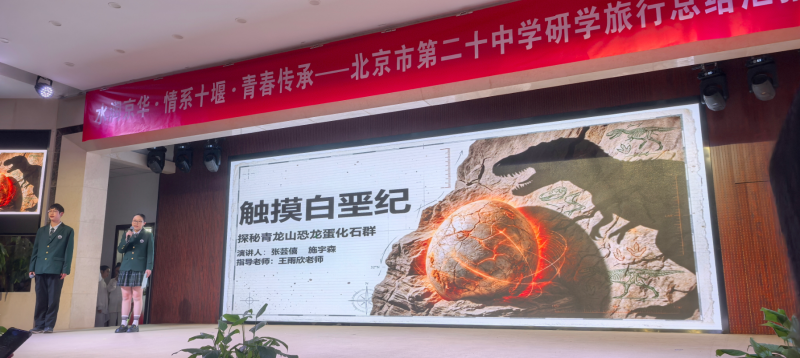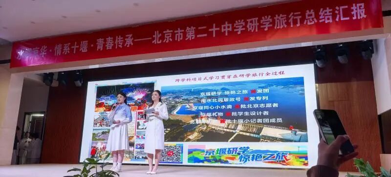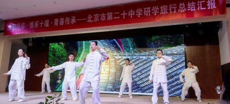总结汇报会上,围绕研学旅程创作编演的太极展示《遇鉴十堰》、歌曲《印象十堰》、RAP《京堰研学情》、朗诵与合唱《东风赋·薪火传》、科普剧《小水滴北上之旅》、情景剧《一渠清水润南北》、研究性学习课题汇报《触摸白垩纪》《从深山车城到世界东风》等展演精彩纷呈,将大家在十堰的收获与启迪搬上舞台,赢得阵阵掌声。